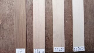 表はスプルース、裏と横はメイプル、ネックはマホガニー、指板はパープルハート。