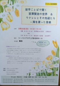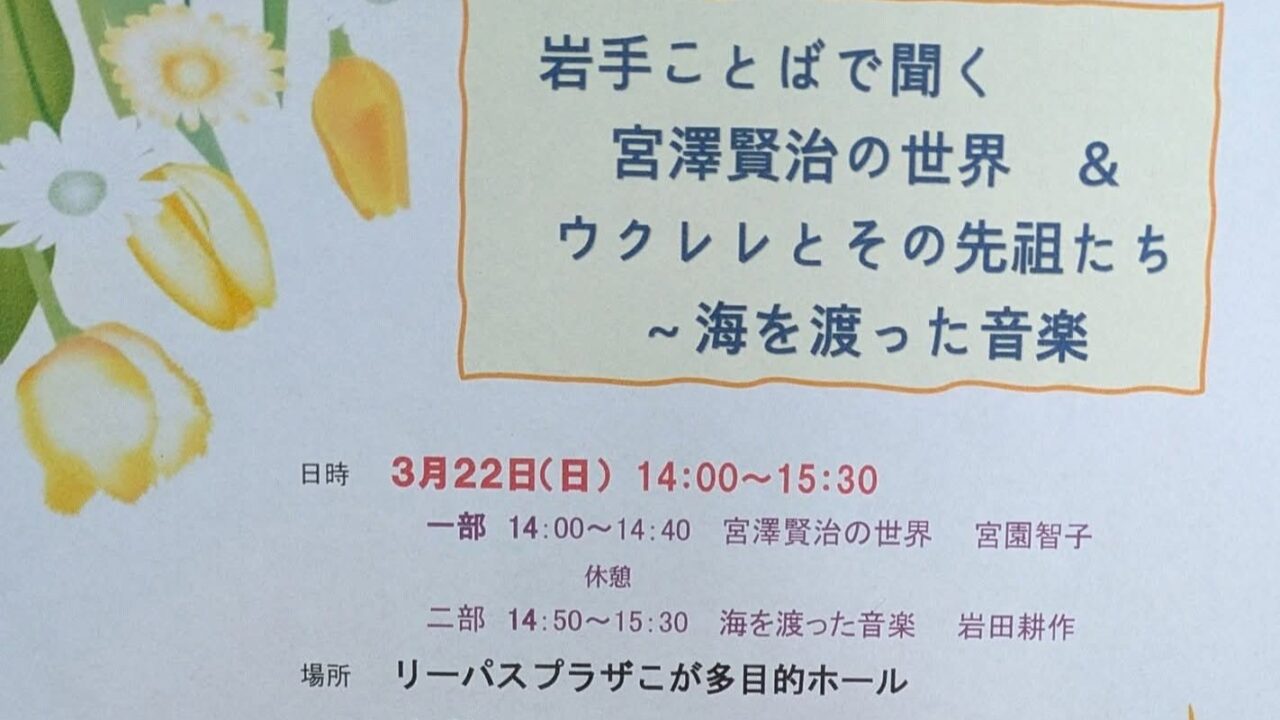 3月22日は、福岡県古賀市のリーパスプラザこがにおいて、「岩手のことばで聞く宮沢賢治の世界 & ウクレレとその先祖たち~海を渡った音楽」と題して、賢治の語りとコンサートのコラボの会に出演します。