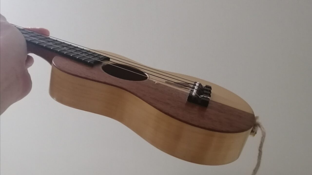 ウクレレのように4弦を高いGに合わせるチューニング(リエントラントチューニング)の楽器は、低音よりは高音域で遊ぶことが元々想定されているので、薄いボディのウスレレが似合うように思えます。実際、ウクレレの源流となったポルトガルの楽器ブラギーニャは、小さくて薄いボディの楽器でした。それが、大型大音量のアコースティックギター音楽が音楽会の主流になるにつけ、ウクレレもその流れに引っ張られて次第に大型化し、厚みのあるボディのものが多くなり、低音を重視するLowGチューニングも広がってきて、アコースティックギターの亜種のような位置づけの楽器に変化してきているような気もします。このへんで、もう一度高音域で遊ぶ元々のウクレレの感覚を見直してみるのも、案外新鮮で良いのではないかと思うしだいです。