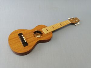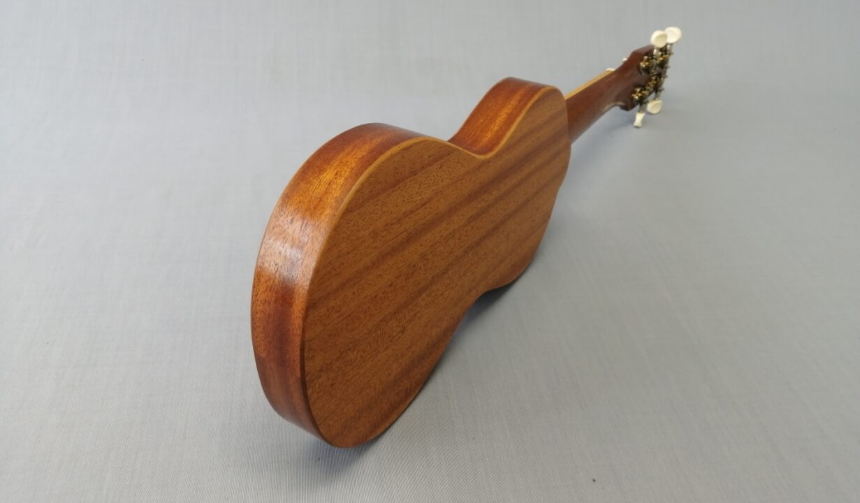 通常のウクレレでは、弦一本当たり4-5㎏ほどのテンションですが、一本当たり2.8㎏ほどまで下げました。これでも案外気持ちよく弾けます。今は押さえられなくても、4-5才くらいになれば、和音の響きを発見するときがくるかもしれません。