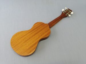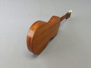 サイドの板幅はわずか25mm(表板裏板の厚み分を入れると、サイドは30mm)。痛くないように角を丸くしなおして、甘々になっていたペグを交換して、古びた金属部分の汚れを磨き、一か所ビビり音が出るところを調整して、幼児でも押さえやすいように弦のテンションを下げて弦交換をしました。